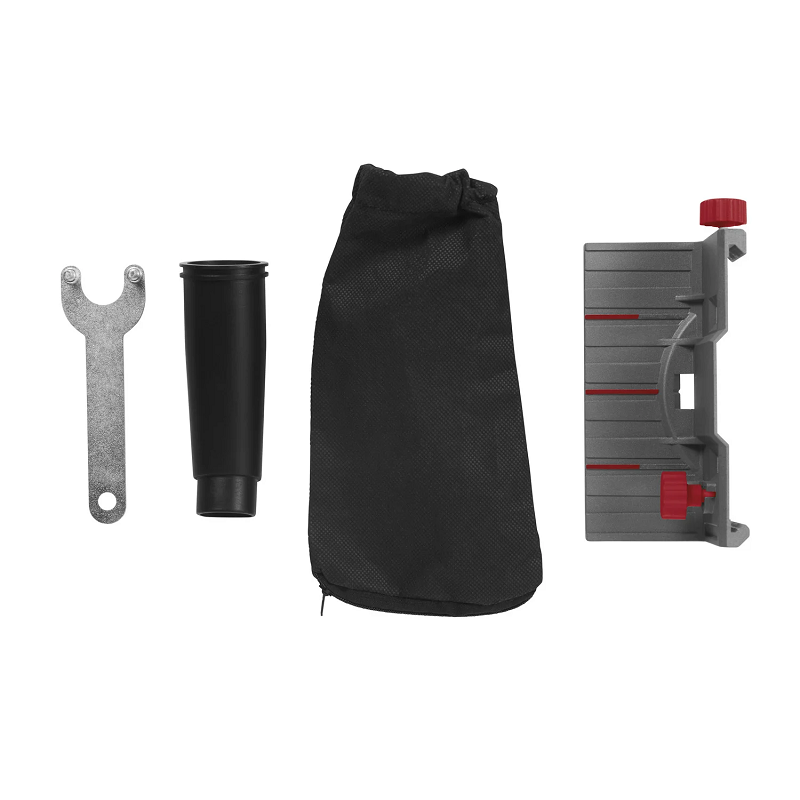 1x adapter for external dust extraction, 1x dirt collection bag, 1x height stop, 1x two-hole wrench